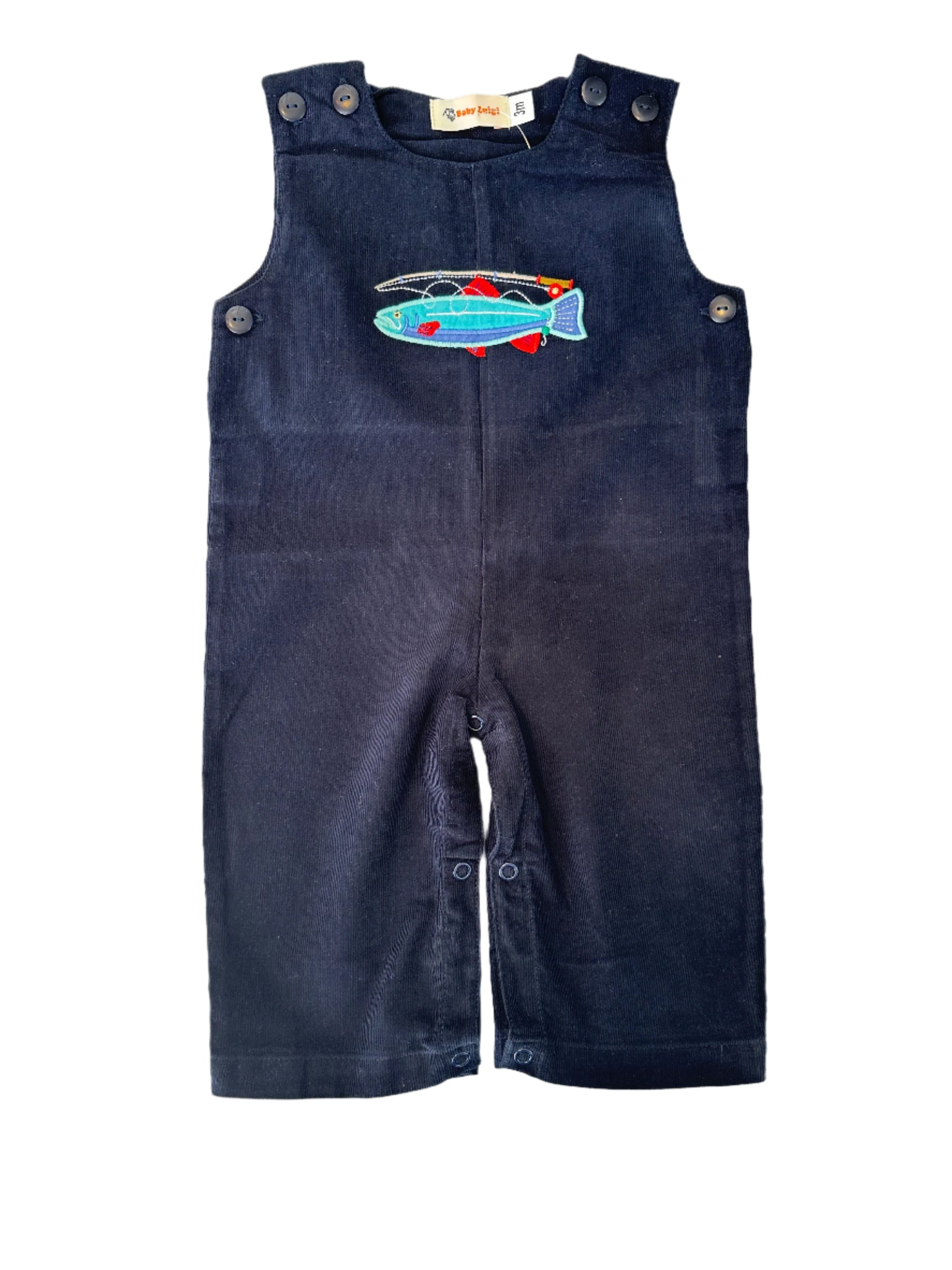 Dark Navy Corduroy Romper. Trout with Fly Rod.